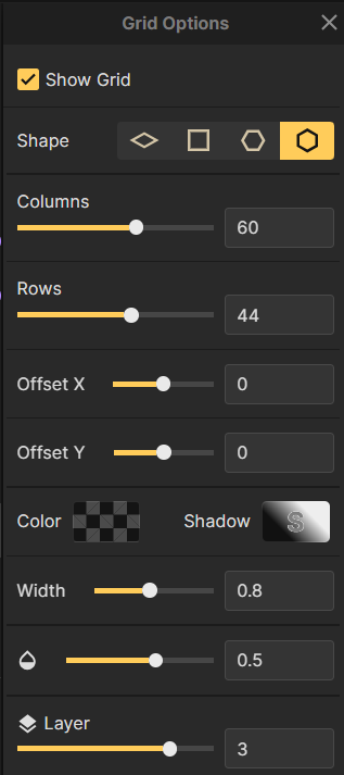 Inkarnate is pretty easy to get the hang of. Nearly all tools on Inkarnate can be applied to hexes. First, you want to set up a grid on your map using the grid tool.
